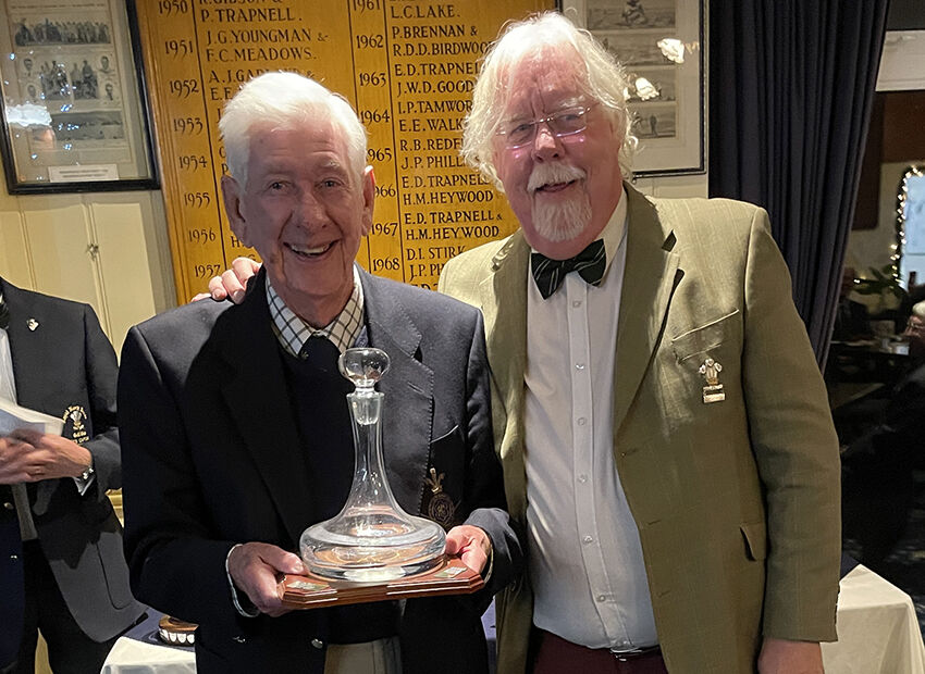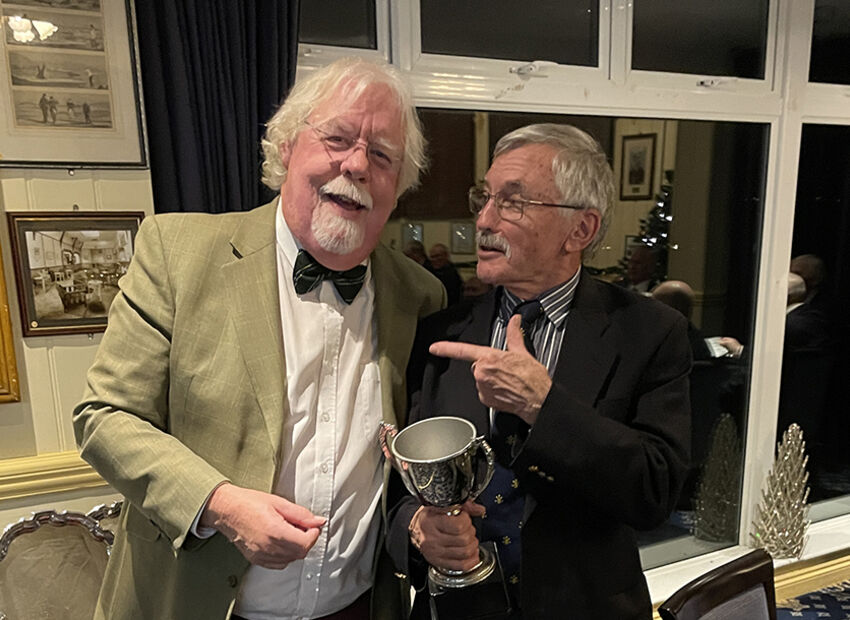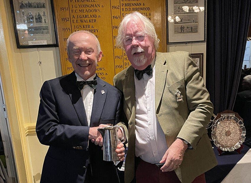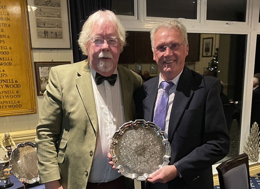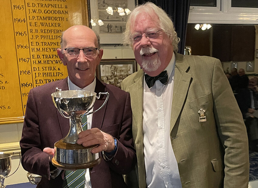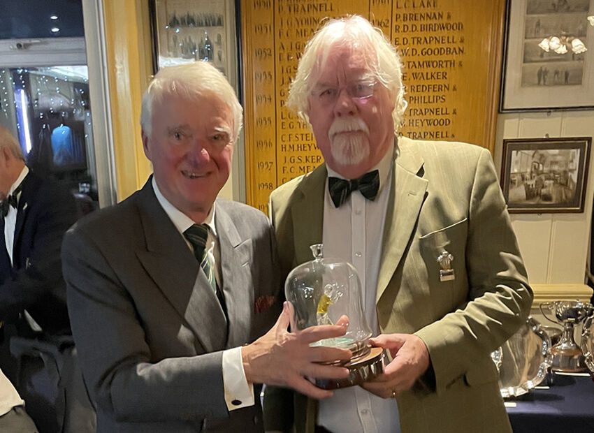 Captain Gary begins the serious business of trophy presentation with an unlikely winner of the Notts Pot – Secretary Phil Hall.